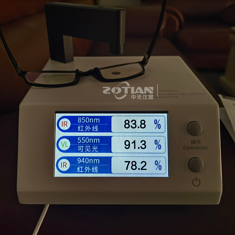OT-850B鏡片透過率測試儀的測試原理是采用紅外850nm光源,紅外940nm光源和可見550nm光源照射被測透明物質(zhì),感應器分別探測三種光源的入射光強和透過被測透明物質(zhì)后的光強,透過光強與入射光強的比值即為透過率,用百分數(shù)表示。