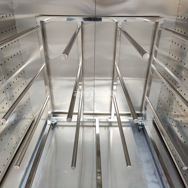 外形采用 1.5mm 厚冷板折彎焊接而成,表面噴電腦白工業(yè)漆(非普通油漆),防生銹,外形尺寸:寬 1600mm,深 830mm,高 1860mm,雙開門, 配加強(qiáng)型不銹鋼門鎖,拉手。底部配可移動(dòng)剎車腳輪,方便烤箱移動(dòng)固定。